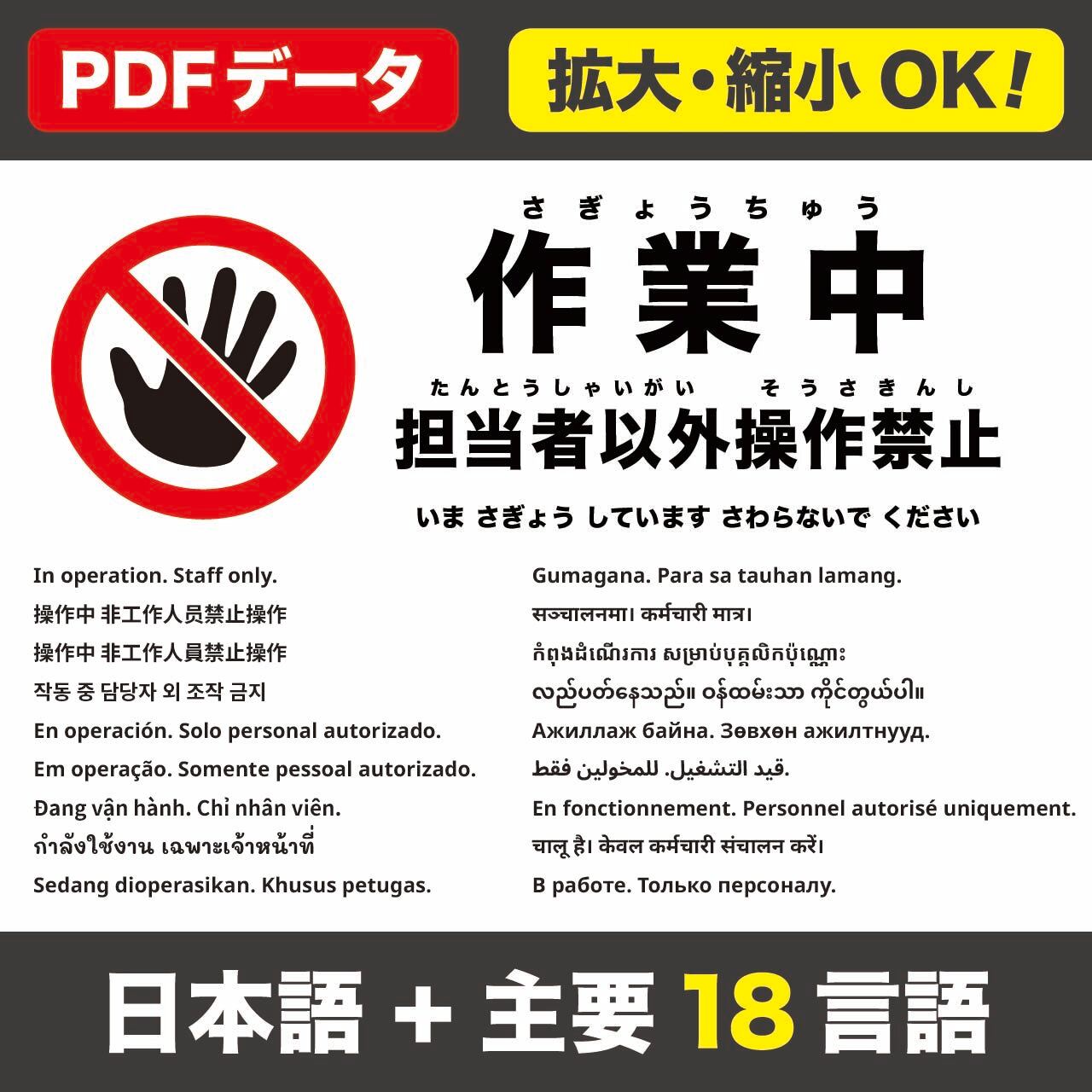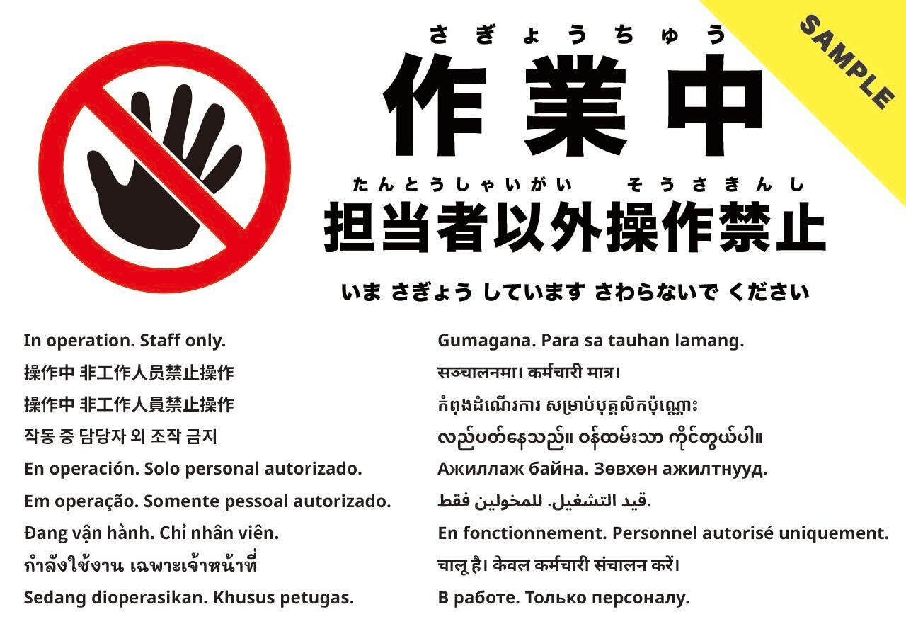 作業中は担当者以外の操作を控えるよう求める張り紙です。