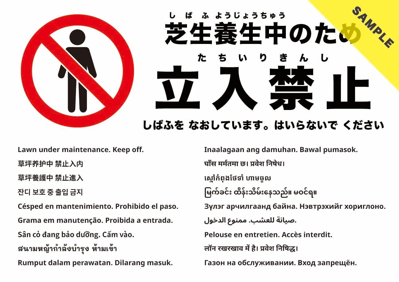 芝生の養生期間中につき立ち入りを控えるよう求める張り紙です。