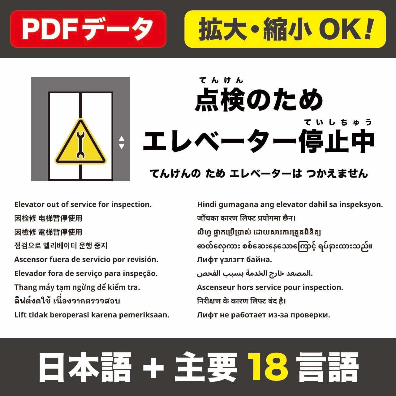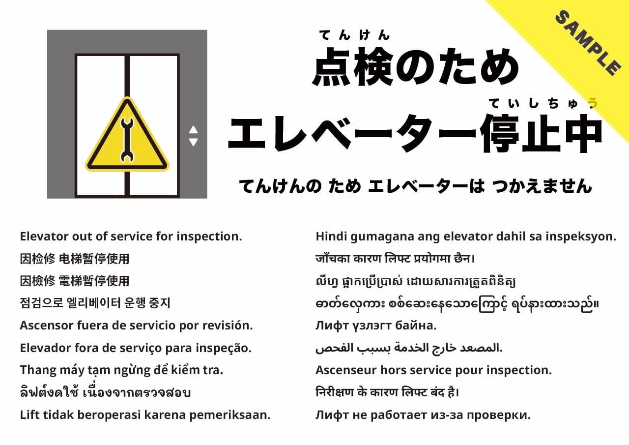 点検作業によりエレベーターが一時停止中であることを知らせる張り紙です。