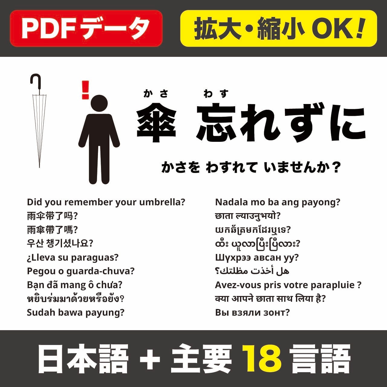 日本語(ふりがな)+18言語(英語/中国語〈簡体・繁体〉/韓国語/スペイン語/ポルトガル語/ベトナム語/タイ語/インドネシア語/タガログ語/ネパール語/クメール語/ミャンマー語/モンゴル語/アラビア語/フランス語/ヒンディー語/ロシア語)