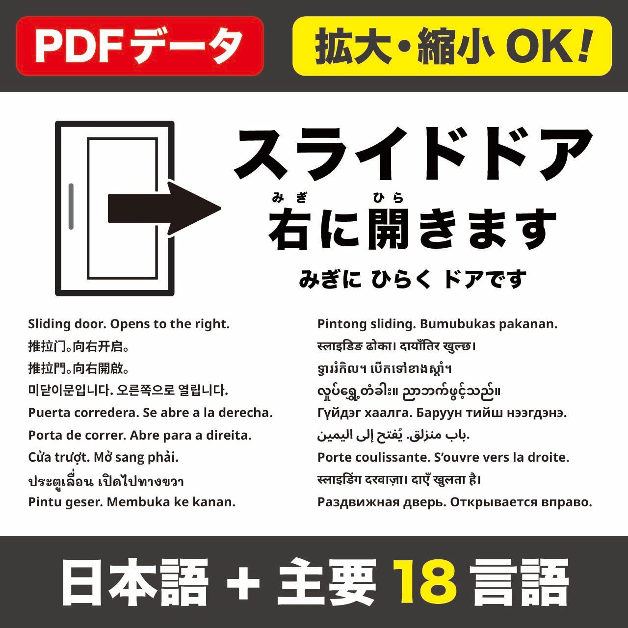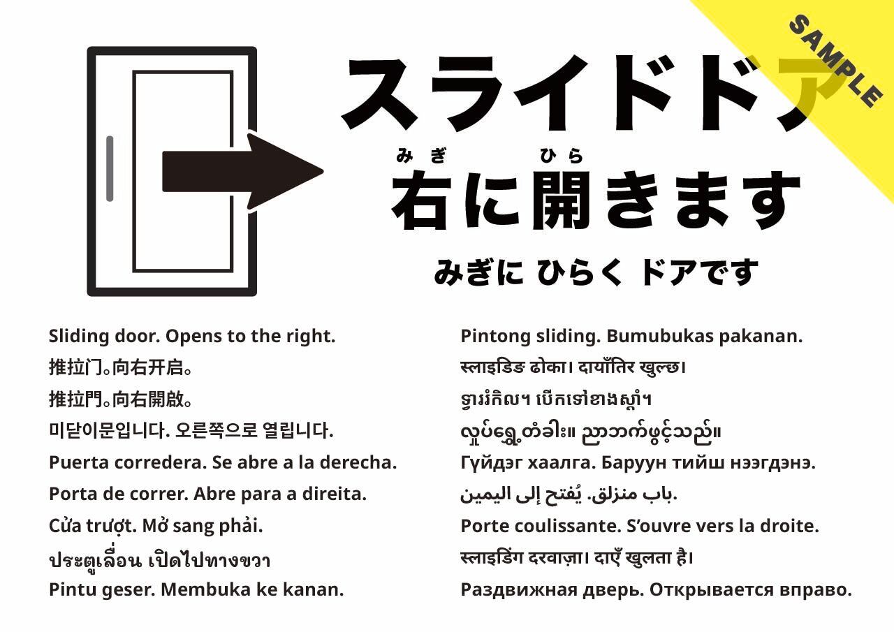 このスライドドアは右方向へ開く旨を案内する張り紙です。