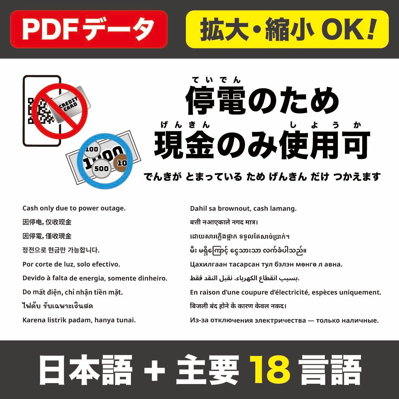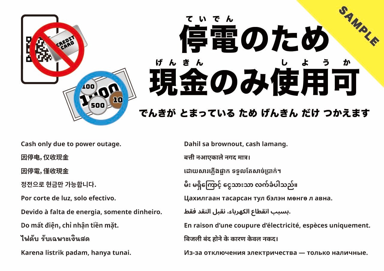 停電の影響により現金のみ利用可能である旨を知らせる張り紙です。