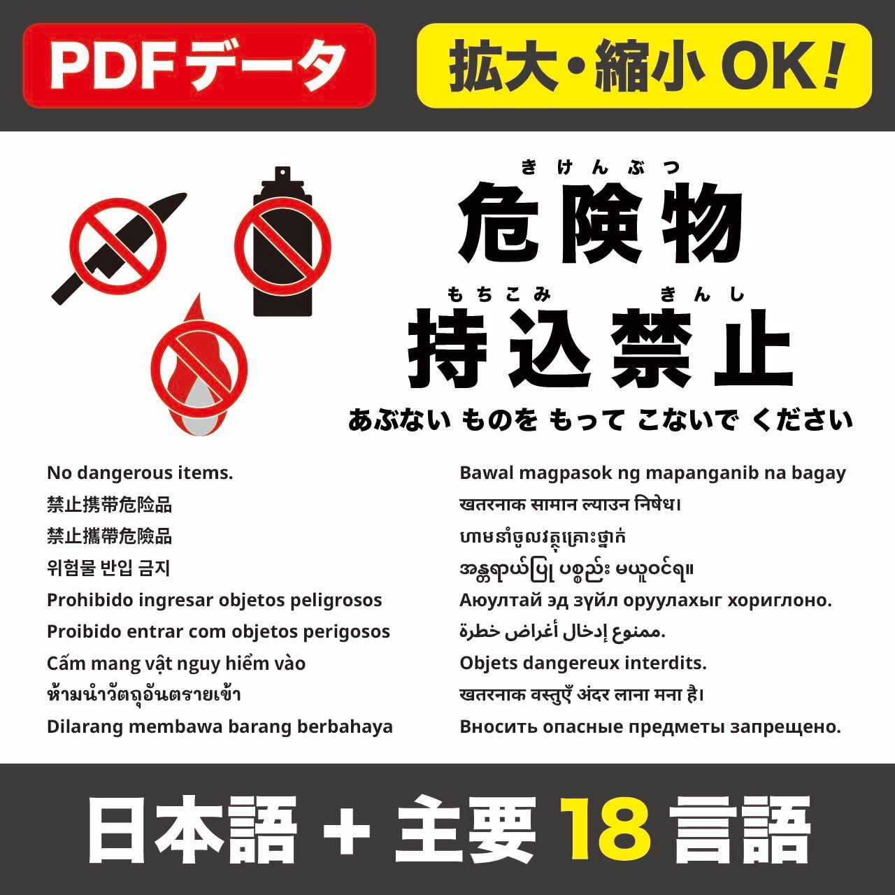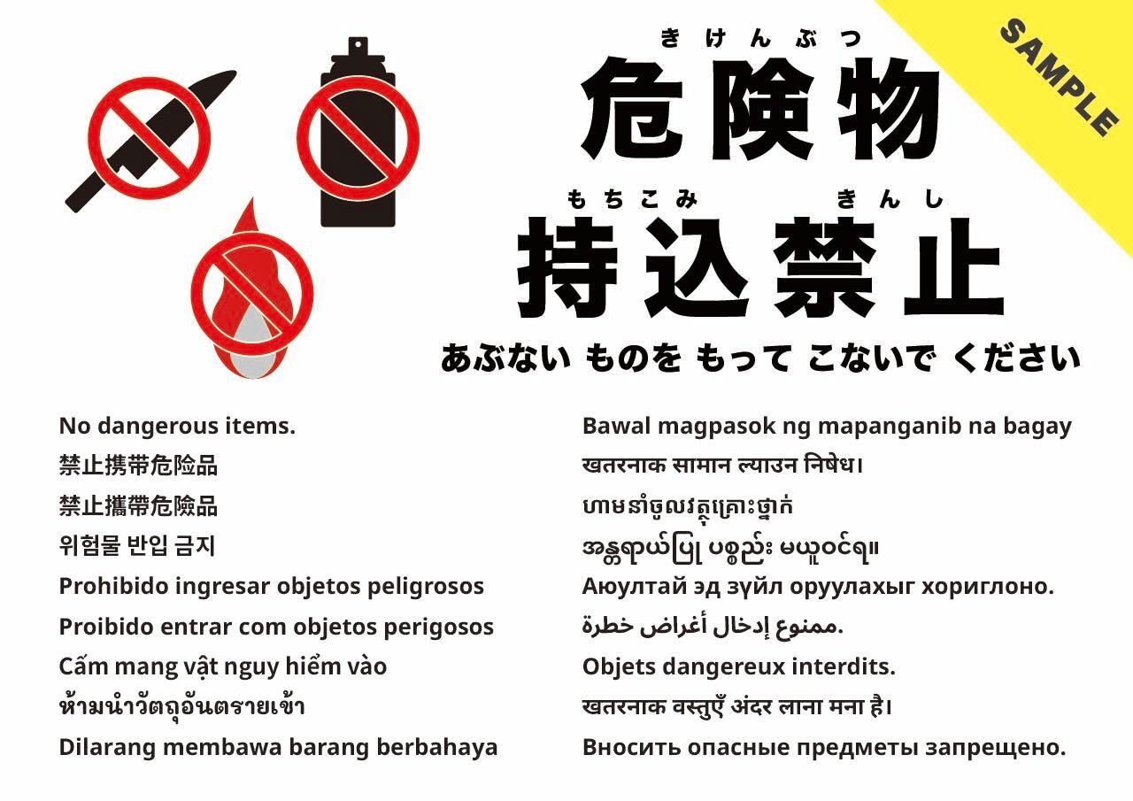可燃物・刃物・薬品など危険物の持ち込みを控えるよう求める張り紙です。