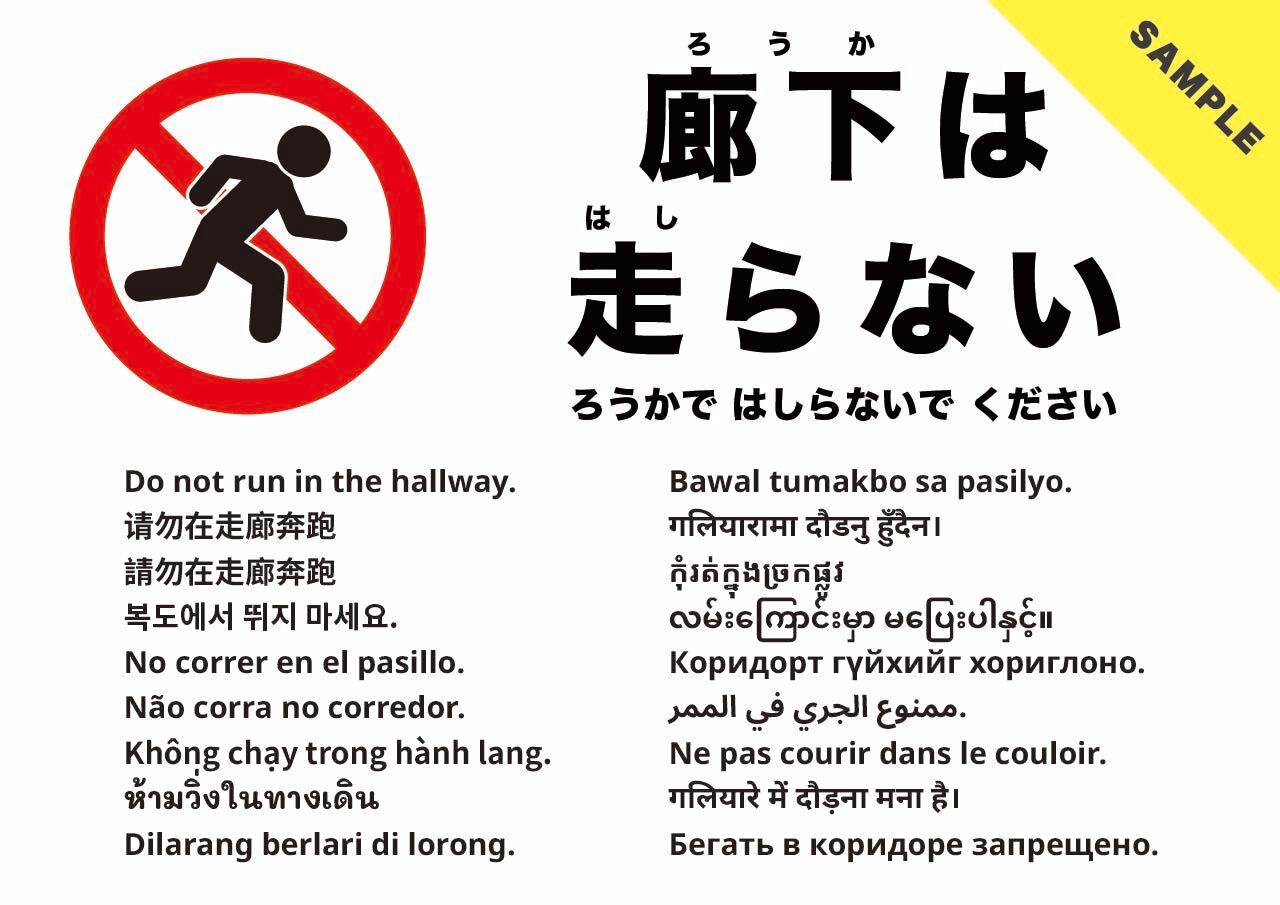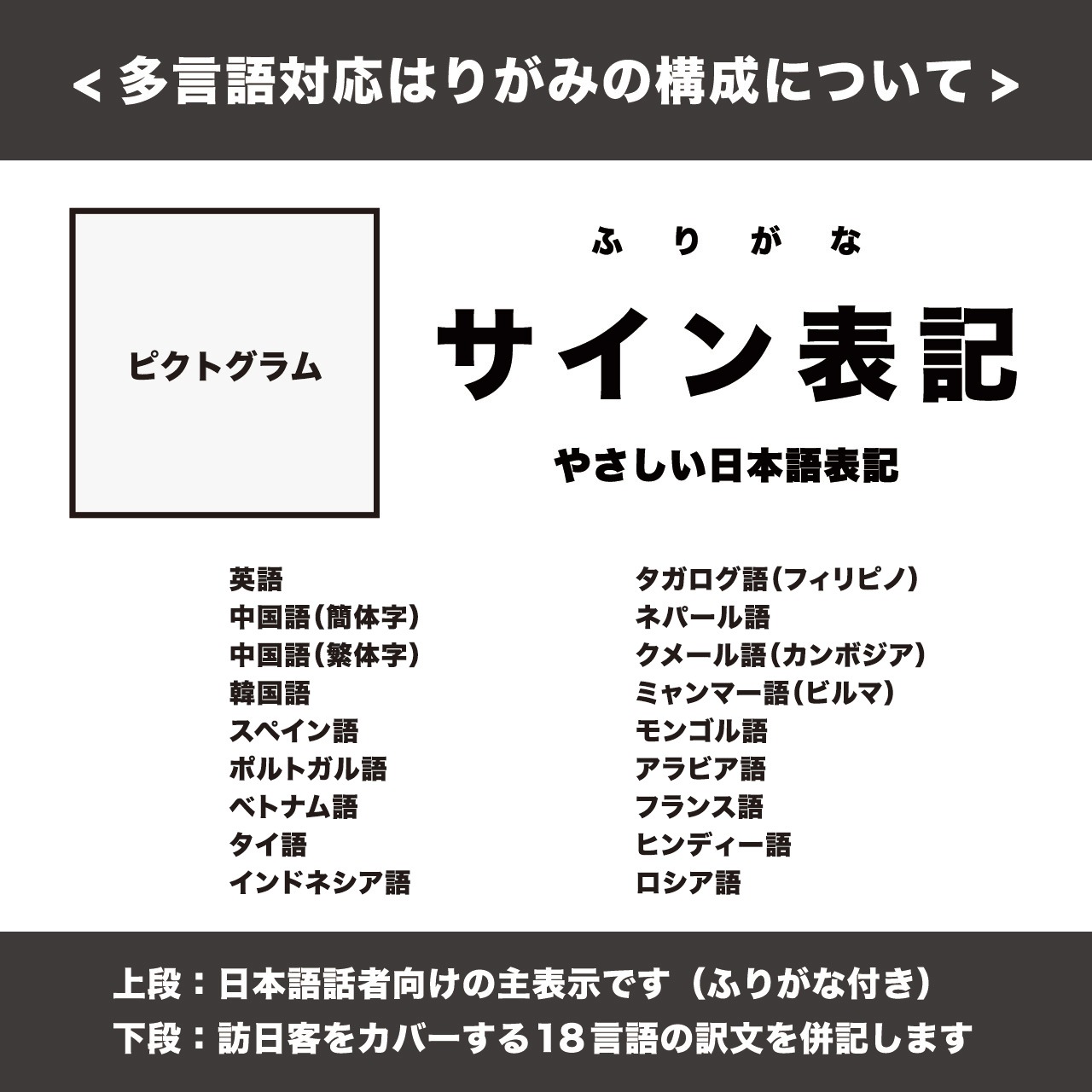 日本語(ふりがな)+18言語(英語/中国語〈簡体・繁体〉/韓国語/スペイン語/ポルトガル語/ベトナム語/タイ語/インドネシア語/タガログ語/ネパール語/クメール語/ミャンマー語/モンゴル語/アラビア語/フランス語/ヒンディー語/ロシア語)