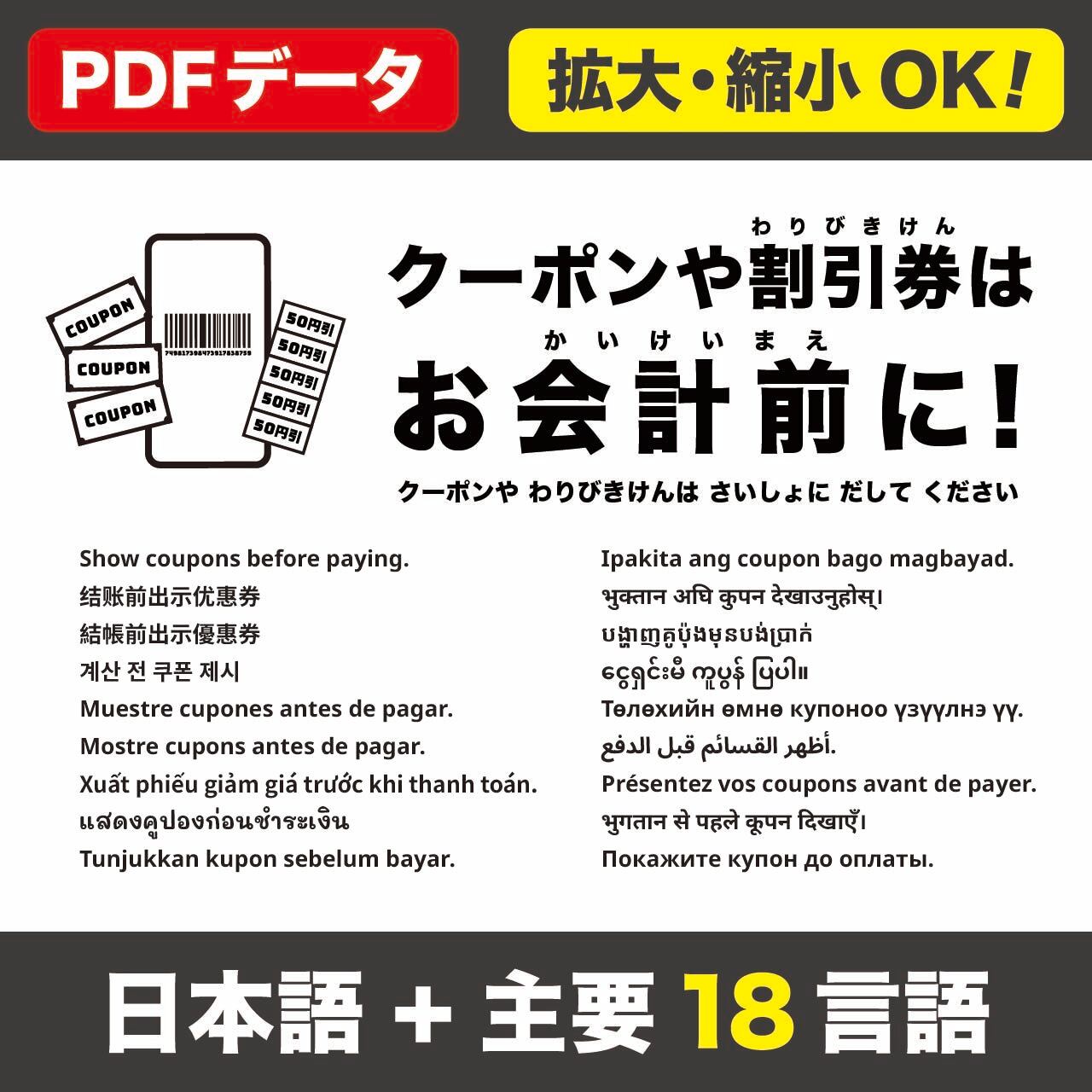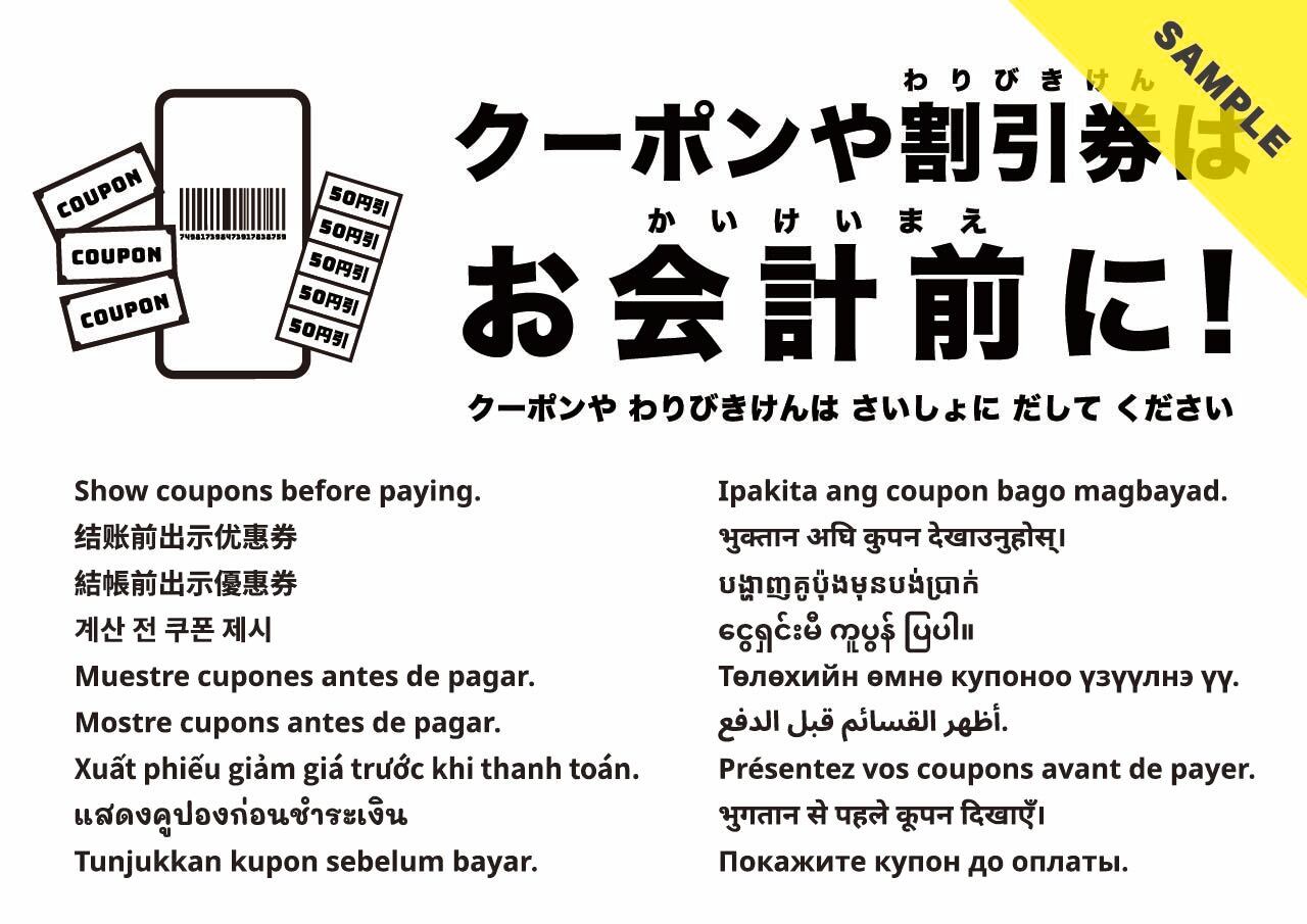 掲示場所:入口・メニュー掲示・レジ列の先頭。