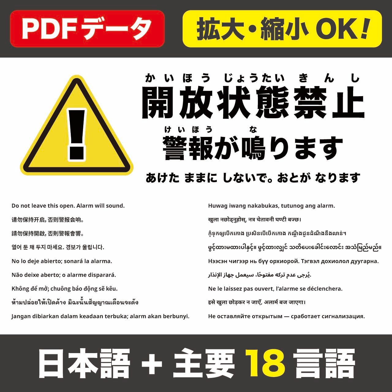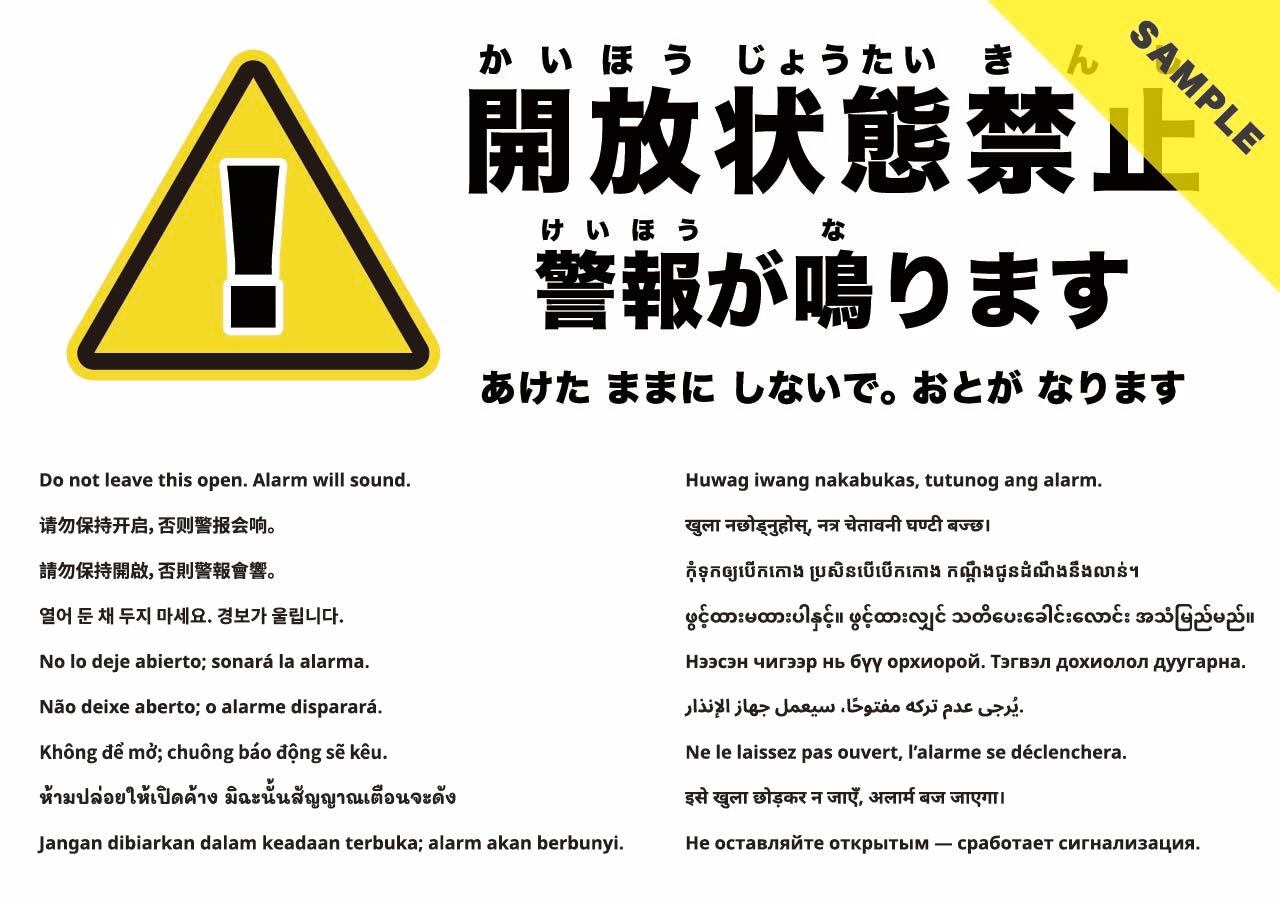 扉やゲートを開放状態にしないよう求め、警報作動の可能性を周知する張り紙です。