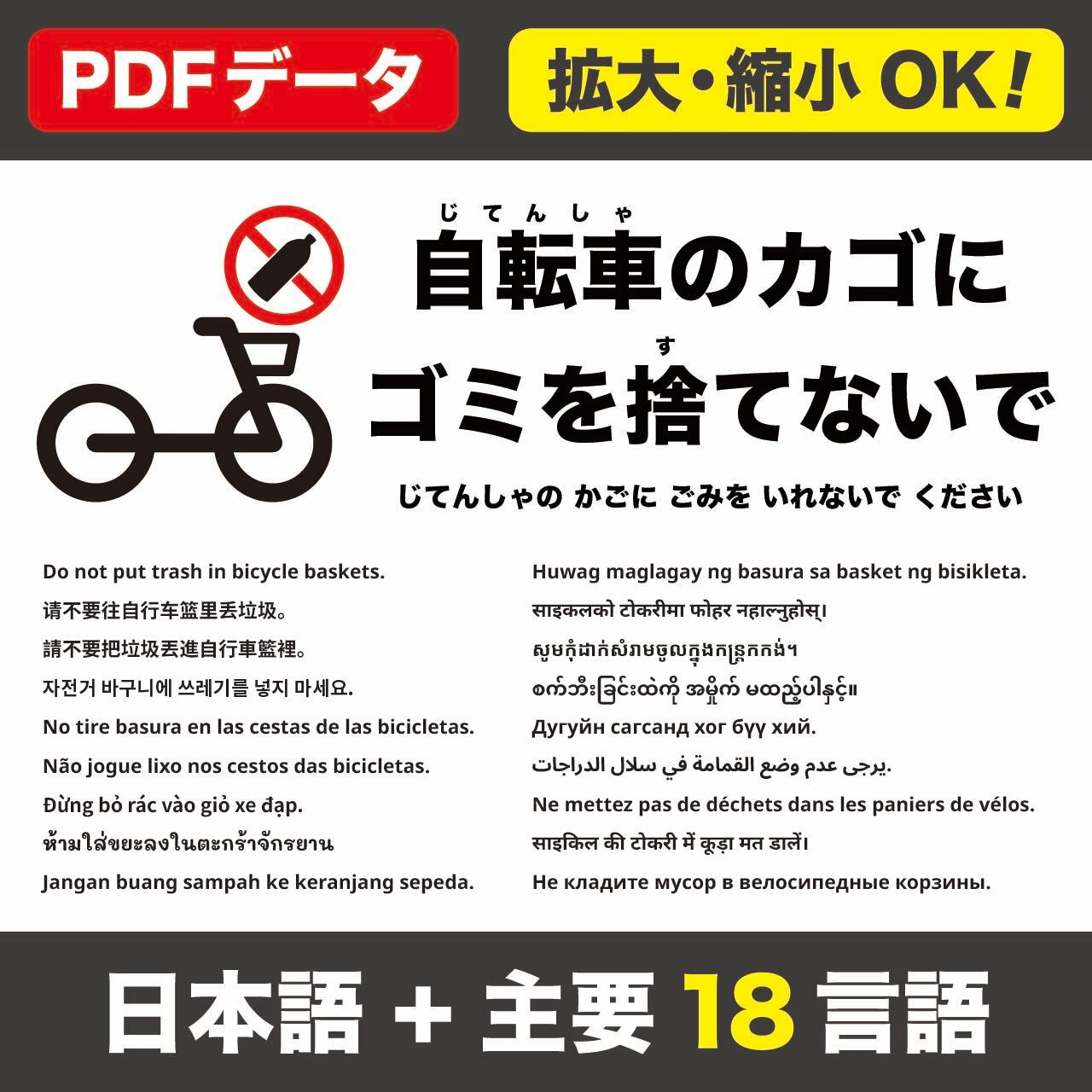日本語(ふりがな)+18言語(英語/中国語〈簡体・繁体〉/韓国語/スペイン語/ポルトガル語/ベトナム語/タイ語/インドネシア語/タガログ語/ネパール語/クメール語/ミャンマー語/モンゴル語/アラビア語/フランス語/ヒンディー語/ロシア語)