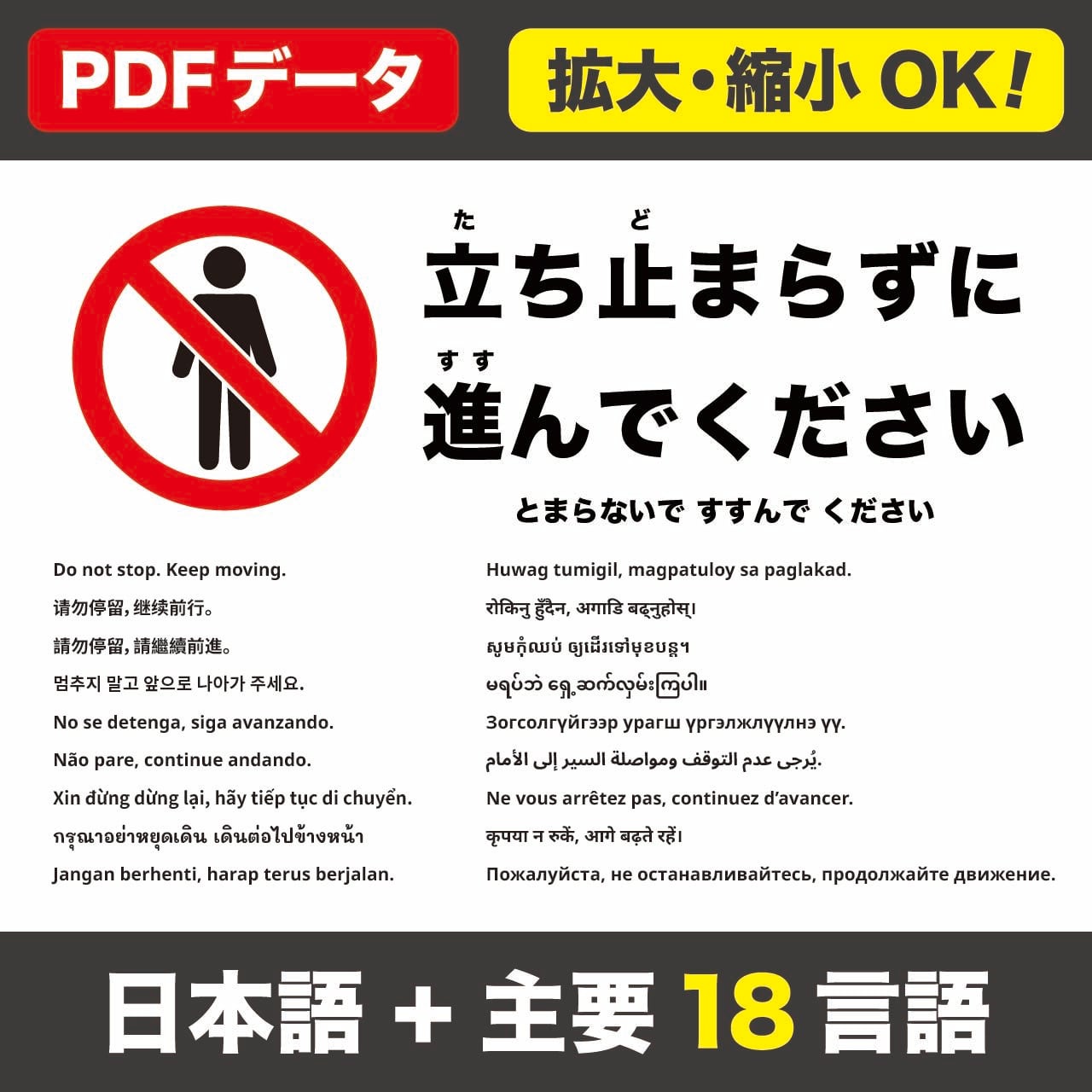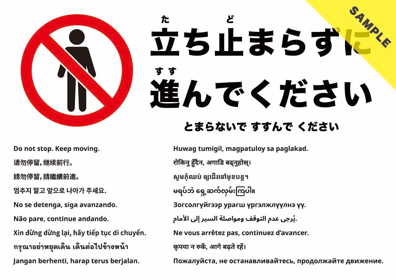 導線上で立ち止まらず前へ進むようお願いする張り紙です。