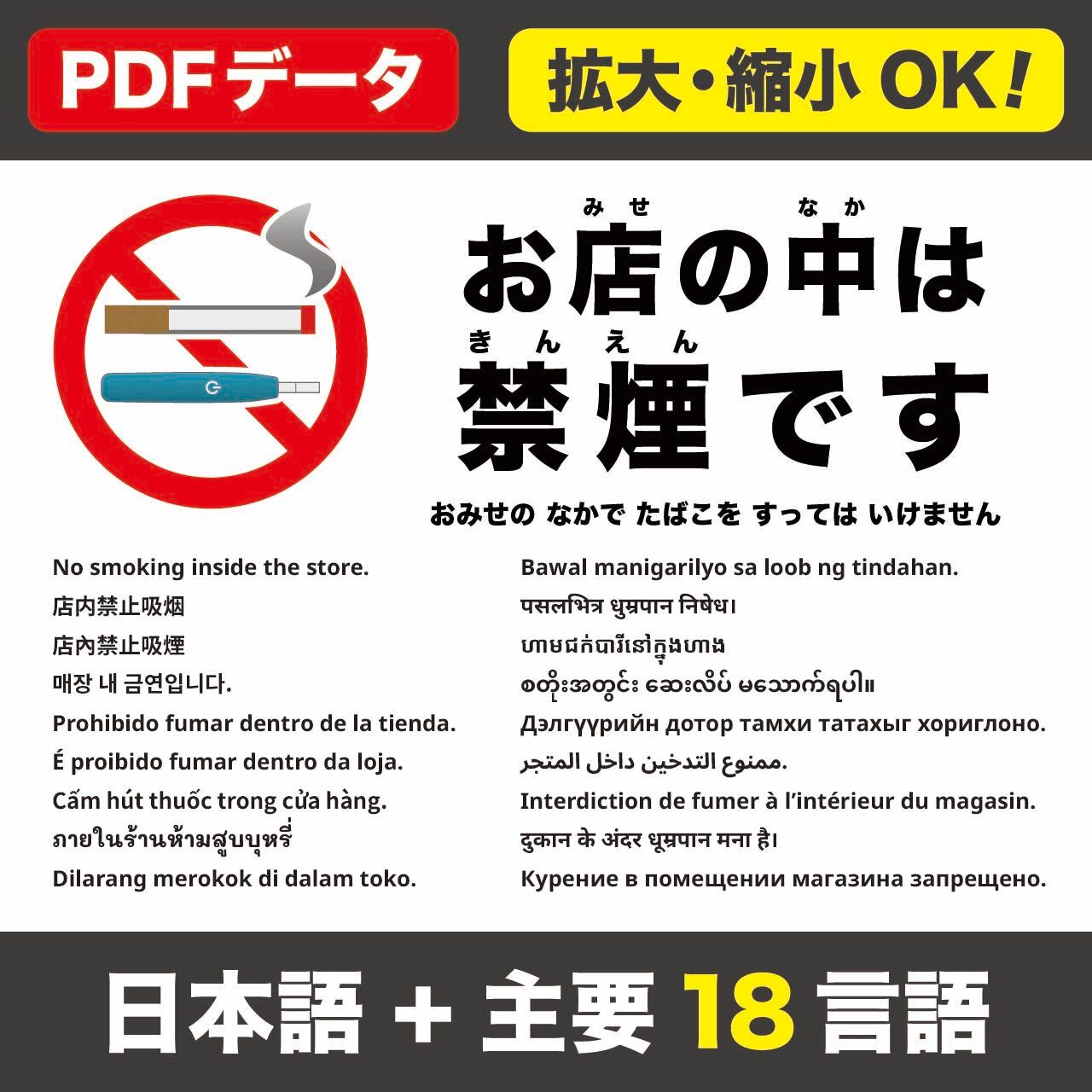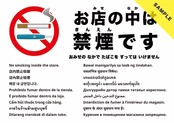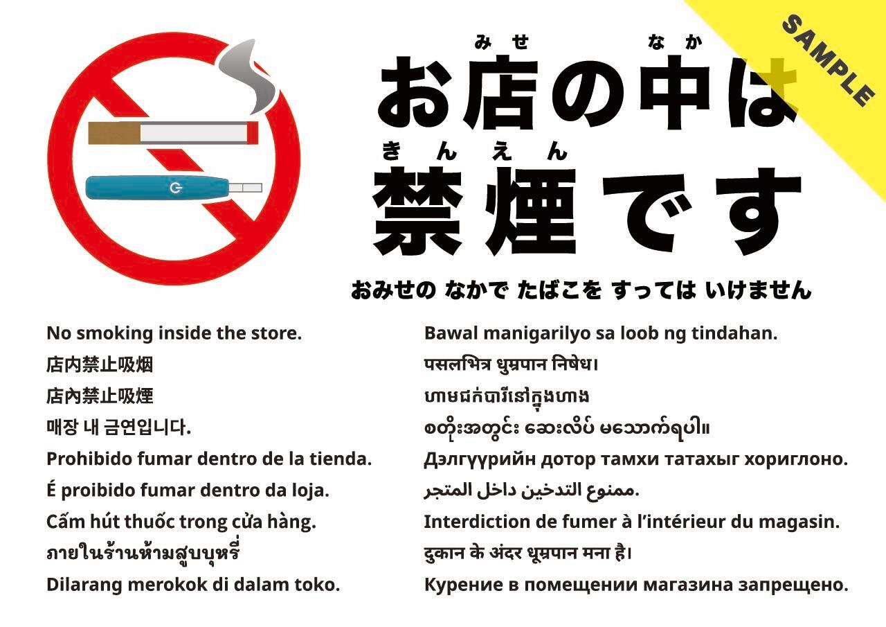 店内が禁煙であることを周知する張り紙です(電子タバコ等を含む)。