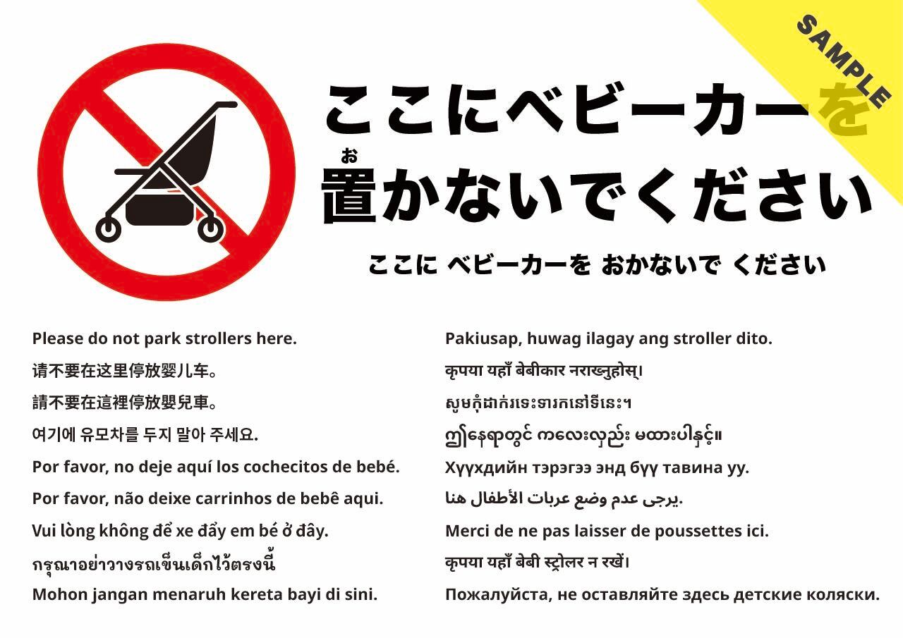 当該場所へのベビーカー放置を控えるよう求める張り紙です。