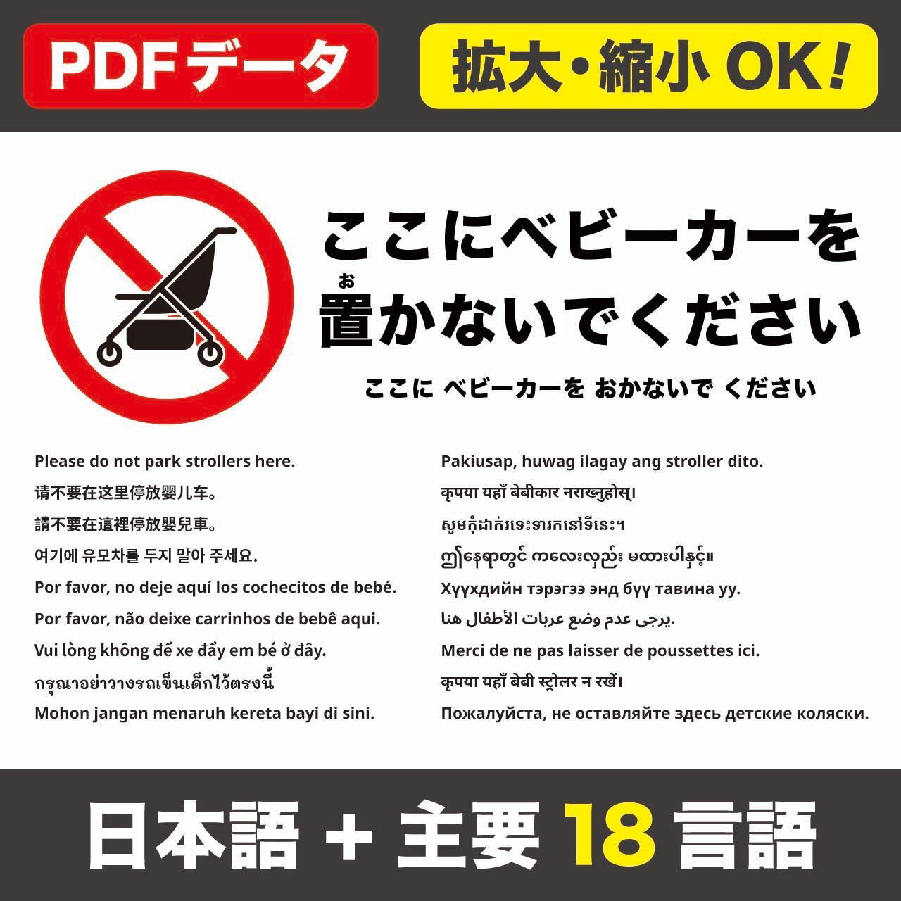 日本語(ふりがな)+18言語(英語/中国語〈簡体・繁体〉/韓国語/スペイン語/ポルトガル語/ベトナム語/タイ語/インドネシア語/タガログ語/ネパール語/クメール語/ミャンマー語/モンゴル語/アラビア語/フランス語/ヒンディー語/ロシア語)