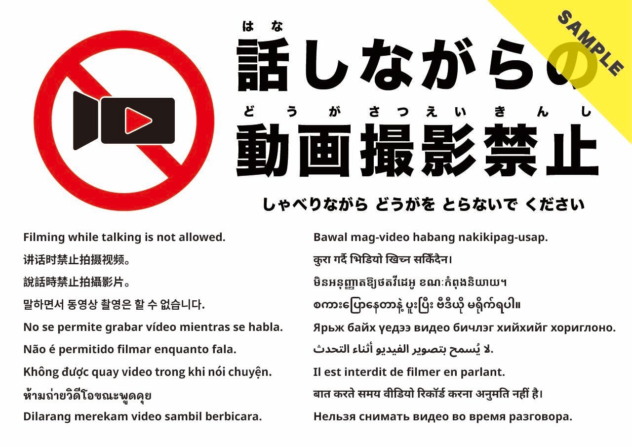 喋りながらの動画撮影(ライブ配信含む)を控えるよう求める張り紙です。